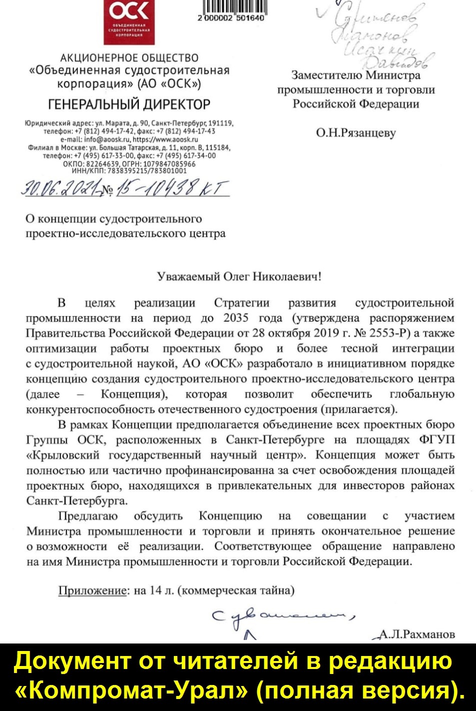 В редакцию «Компромат-Урал» поступила информация в продолжение расследования, опубликованного на днях нашими коллегами из издания «Версия». Гласности предано письмо главы АО «Объединённая судостроительная корпорация» Алексея Рахманова к замминистра промышленности и торговли Олегу Рязанцеву.