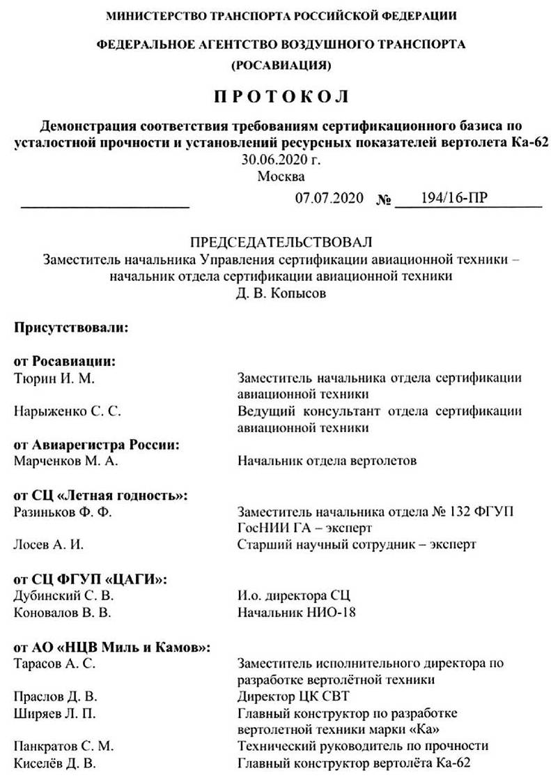 Как мы писали ранее, в январе месяце 2020 года, на своём официальном сайте Государственная корпорация «Ростех» «торжественно» заявила, что «Национальный центр вертолётостроения холдинга «Вертолёты России» Госкорпорации «Ростех» приступил к началу сертификационных испытаний вертолёта Ка-62, которые планируется завершить в 2020 году. Гендиректор АО «Вертолёты России» (судя по сделанному заявлению, совершенно не разбирающийся в теме) нарисовал радужную картину: «Вертолет соответствует всем современным требованиям и имеет большой экспортный потенциал. К машине проявляют интерес компании нефтегазового сектора и другие гражданские структуры. Кроме того, в соответствии с подписанным соглашением с администрацией Приморского края наши первые машины планируется эксплуатировать в Приморье». Однако, судя по Протоколу № 194/16-ПР от 07.07.2020 года администрации Приморского края придётся очень долго ждать вертолёты Ка-62, как, впрочем, газовикам и другим гражданским структурам.