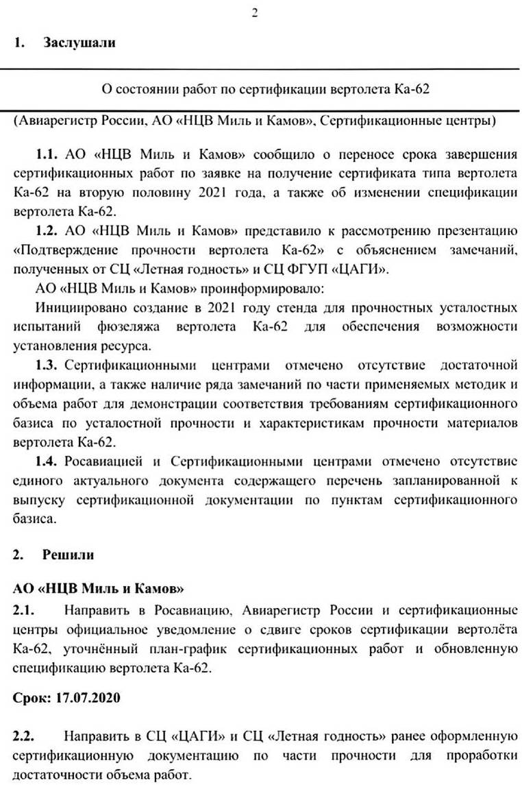 Редакция «Компромат-Урал» по просьбе наших коллег продолжает следить за результатами журналистского расследования проблем в сертификации «новейшего» (по версии АО «Вертолёты России») вертолёта Ка-62. СМИ высказывают обоснованные предположения, «что планы по завершению сертификации в 2020 году нереализуемы. Совещание, под председательством заместителя начальника управления сертификации авиационной техники Федерального агентства воздушного транспорта (Росавиация) Дмитрия Копысова, состоявшееся 7 июля 2020 года полностью подтвердило наше предположение.