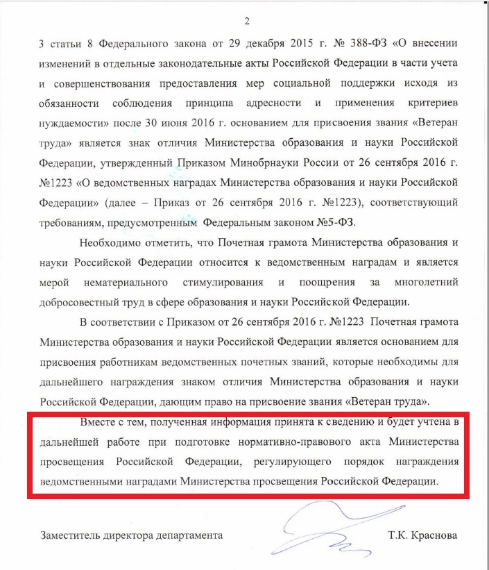 В нашей публикации сообщалось о нарушении прав тех работников сферы образования, которые награждены Почётной грамотой Минобрнауки России, но, в отличие от своих коллег из других отраслей, не могут претендовать на звание «Ветерана труда». Причина – в приказе приказ главы Минобрнауки Васильевой от 26 сентября 2016 года, за номером 1223.