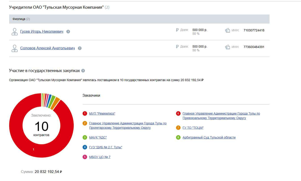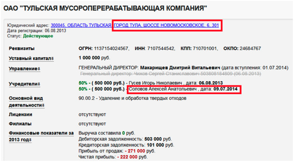 Как можно видеть на кадре выше, в равных долях бизнесмены владеют ОАО «Тульская мусороперерабатывающая компания». И ладно Гусев, он много в каких тульских компаниях замечен, ведёт дела, и вряд ли кто-то обратил на него пристальное внимание, если бы не это соседство с Солововым.