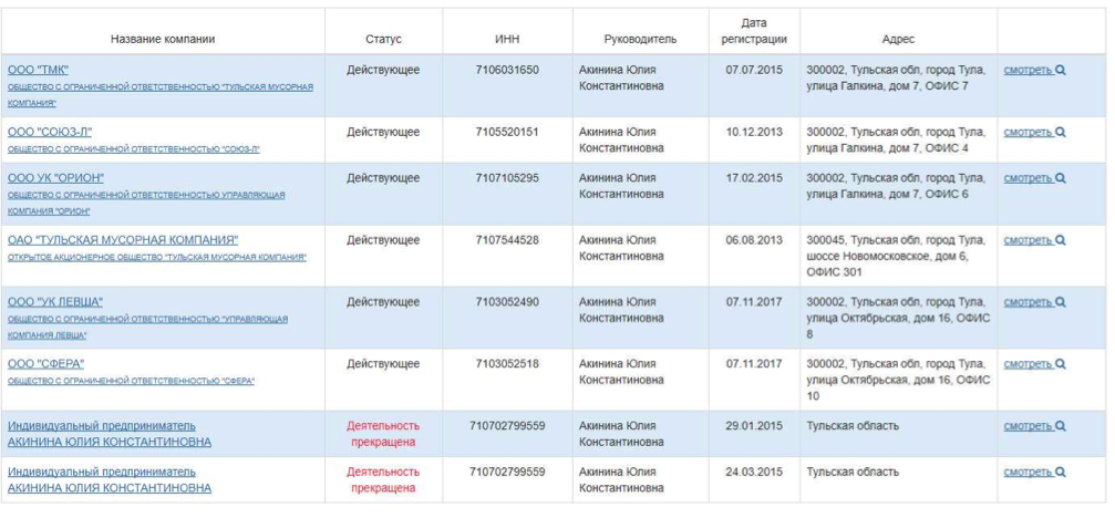 К слову, у «Тульской мусорной компании» общий директор с «Орионом» - Юлия Константиновна Акинина (ИНН 710702799559). Она не только успешная бизнес-леди, но и аффилирована Соловову и Гусеву, а полный список предприятий, где ей доверено руководство, выглядит как-то так: