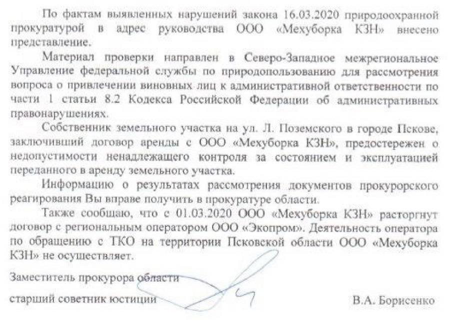 Впоследствии в окрестностях святых для всей России мест возникли несанкционированные свалки, куда, судя по всему, именно «Мехуборка» привозит и сваливает кучи мусора непонятно из чего состоящего, в каких объёмах, откуда привезённого, поскольку никто сейчас за этим не следит и не проверяет. В нашем распоряжении имеются ужасающие видеокадры этих свалок в окрестностях Пушкинских гор, Псково-Печерского монастыря, рядом с Плюссой и Новоржевом. И когда глава Новоржевского района пытается как-то повлиять на этот беспредел, её, невзирая на видеокамеру, нагло и демонстративно посылают по известному адресу, объясняя своё хамство примерно такой фразой: «А Путин нам не указ». Про рост тарифов для населения, несмотря на отмену 18% НДС на данный вид деятельности, и говорить не приходится. Это, как объяснялось новым оператором в псковских новостях, якобы никак не связанные между собой понятия.