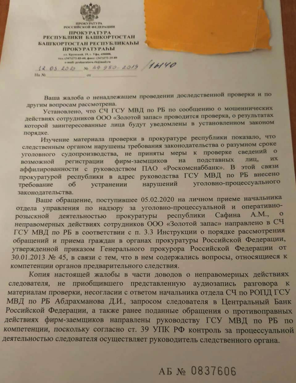 18 июня 2020 года группа займодавцев получают такой же ответ от самого прокурора Республики Башкортостан Владимира Ведерникова: «По фактам допущенных нарушений уголовно-процессуального законодательства прокуратурой республики приняты меры реагирования».