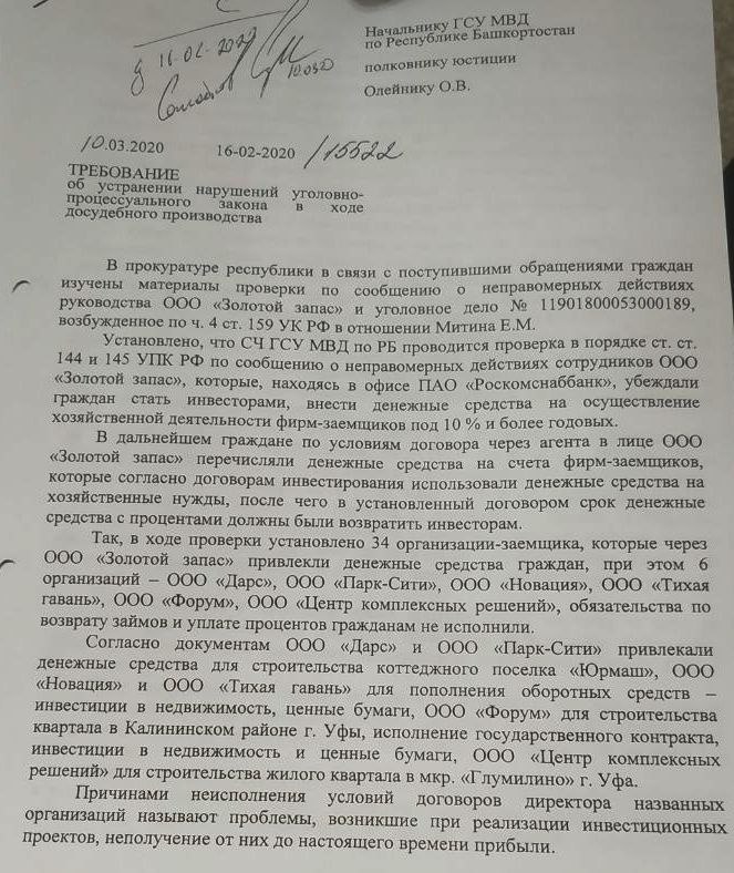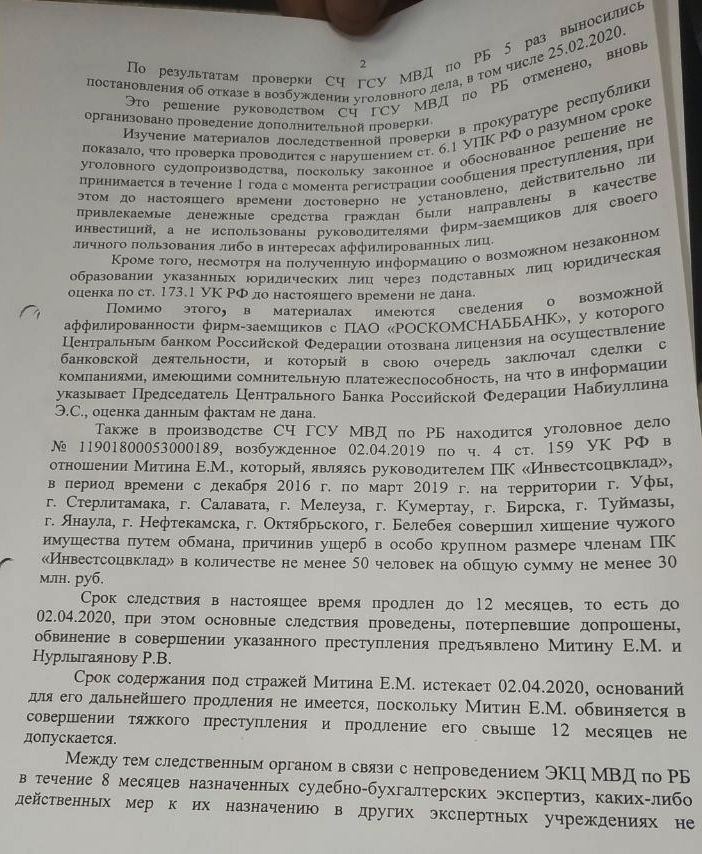 В документе указано, что «проверка проводится с нарушением ст. 6.1 УПК РФ о разумном сроке уголовного судопроизводства, поскольку законное и обоснованное решение не принимается в течение года (!!!) с момента регистрации сообщения о преступлении. При этом до настоящего времени достоверно не установлено, действительно ли привлекаемые денежные средства граждан были направлены в качестве инвестиций, а не использованы руководителями фирм-заёмщиков для своего личного пользования либо в интересах аффилированных лиц. Кроме того, несмотря на полученную информацию о возможном незаконном образовании указанных юридических лиц через подставных лиц юридическая оценка по ст. 173.1 УК РФ до настоящего времени не дана. Помимо этого, в материалах имеются сведения о возможной аффилированности фирм-заёмщиков с ПАО «Роскомснаббанк», у которого Центральным банком РФ отозвана лицензия на осуществление банковской деятельности, и который в свою очередь заключал сделки с компаниями, имеющими сомнительную платежеспособность, на что в информации указывает Председатель Центрального Банка РФ Набиуллина Э.С., оценка данным фактам не дана».