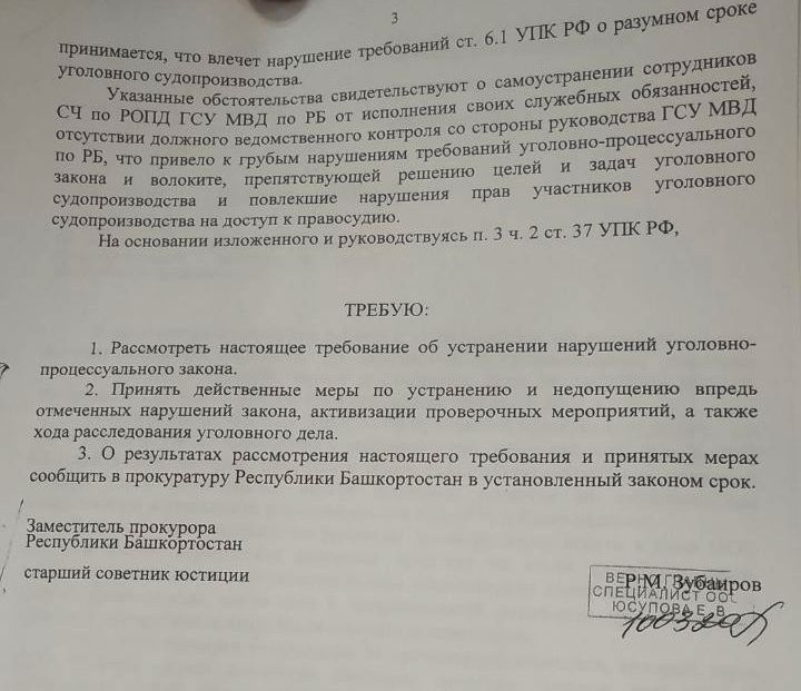 Очень интересно, как на такое требование отреагировало МВД Республики Башкортостан? А очень просто. Давай ознакомимся с их дословной отпиской. «В ходе проведения проверки доводы, изложенные в требовании, нашли своё подтверждение в связи с нарушением заместителем начальника отдела СЧ по РОПД ГСУ МВД по РБ подполковником юстиции Нуршаяховым М.Д. требований ст. 6.1. УПК РФ. Заместителю начальника отдела СЧ по РОПД ГСУ МВД по РБ подполковнику юстиции Нуршаяхову М.Д. строго указано на необходимость активации проверочных мероприятий, направленных на выяснение по материалам законного и обоснованного решений в установленные сроки». То есть, погрозили пальчиком нерадивому подполковнику? И всё?