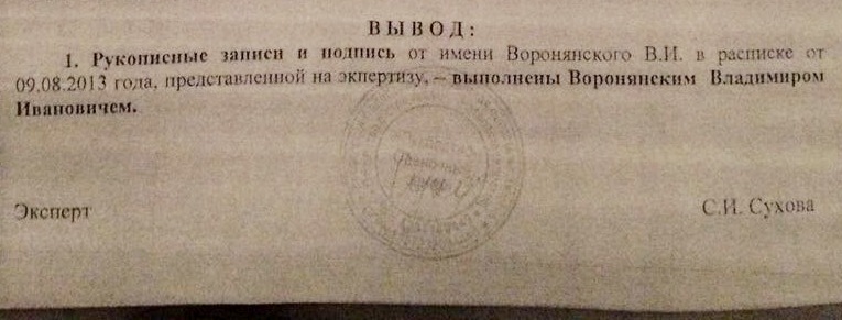 Чтобы окончательно подтвердить ложность обвинений Сапичева в мошенничестве, в суд представлено заключение о почерковедческой экспертизе вышеназванной расписки Воронянского. Эксперт Светлана Сухова, с 14 летним стажем почерковедческих экспертиз, с допуском от МВД, констатировала: расписка выполнена собственноручно Воронянским Владимиром Ивановичем. Однако и этот факт не повлиял на лютый приговор, вынесенный судьей Кузьминой. Как так? «Потерпевший» заявляет: ущерба нет, преступления нет, не привлекайте никого к уголовной ответственности. Есть его же рукописный документ, подтверждающий фейковость обвинений – были типичные гражданско-правовые отношения. Но судье все нипочем, «считает вину доказанной». Легче поддаться общей обвинительной инерции – оправдать подсудимого себе дороже? Допускаем, что так. Но немыслимую суровость приговора данный мотив не объясняет.