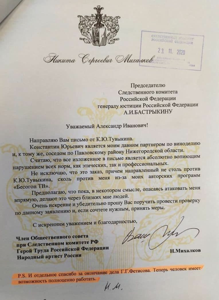 Вообще, жаловаться на Михалкова — занятие крайне неблагодарное. Он водит знакомство с сильными мира сего, и преспокойно просит главу СК РФ Александра Бастрыкина за своих друзей. В распоряжении редакции «Компромат-Урал» — письмо Михалкова в адрес главы СК по поводу «друга и партнера» Михалкова, нижегородского бизнесмена Константина Тувыкина. Соседа Михалкова по Павловскому району Нижегородской области.