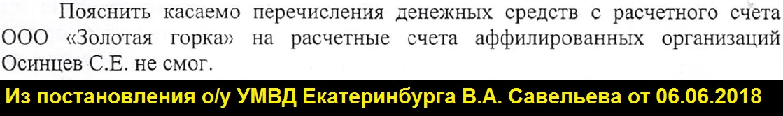 И совсем издевательски в постановлении полиции читается: «Пояснить касаемо перечисления денежных средств с расчётного счёта ООО «Золотая горка» на расчётные счета аффилированных организаций Осинцев С.Е. не смог». То есть директор предприятия-банкрота, по сути, «включает дурачка», и правоохранителей такое поведение опрашиваемого вполне устраивает. Обманутые дольщики и явные признаки умысла в действиях руководства ООО «Золотая горка» государевых людей (прокуратуру, полицию, Росфинмониторинг…) не интересуют?