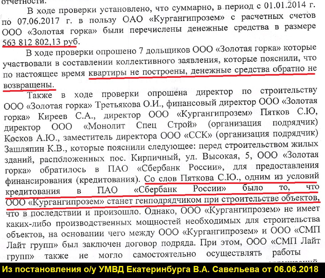 Что следует из этих откровений? Затевается большой девелоперский проект «Золотая горка» с участием многочисленных дольщиков и кредитных средств Уральского банка Сбербанка (госбанк предоставил полмиллиарда). И якобы уже на старте менеджеры Сбера поставили ультиматум: откроем кредитную линию, если застройщик отдаст практически всю сумму какому-то «Кургангипрозему». Юрлицу без реальных активов, производственных мощностей, с фиктивным адресом (как потом установят налоговики). Затем деньги из этой пустой фирмы прогоняются через ещё одну пустышку – «СМП Лайт групп».