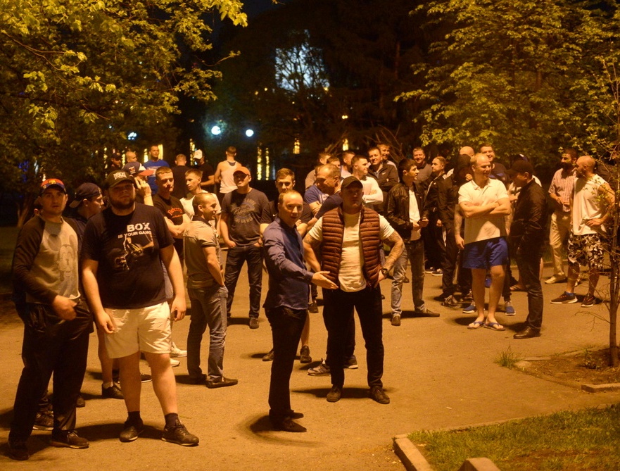 Обстановка перестала быть мирной в одиннадцатом часу вечера. Группами к скверу начали стягиваться спортивные ребята. Сначала они кучковались на улице Бориса Ельцина, а затем - сосредоточились в самом сквере у палатки, где лежал первый камень храма. Неожиданно они выкинули вверх правые руки и, скандируя «Мы за храм!», начали выдавливать горожан за пределы зеленой зоны.