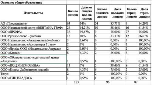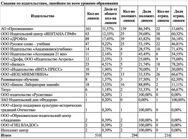 Например, отрицательные заключения по итогам допэкспертизы получили почти все учебники издательства «Академ-книга» (кроме учебников по физической культуре) и большая часть входящего в «Российский учебник» издательства «Астрель» (кроме учебников по математике). Не получило положительных заключений экспертов подавляющее большинство учебников издательств, ранее выбывших из перечня (начиная с 2014г.) и предоставивших их вновь для рассмотрения в Минобрнауки. Отрицательно оценены почти все учебники «Балласа», «Мнемозины», «Титула» и «Развивающего обучения» (последние использовались еще в системе образования Советского Союза и хорошо известны как «система Занкова»), до сих пор активно использующиеся в школах страны.