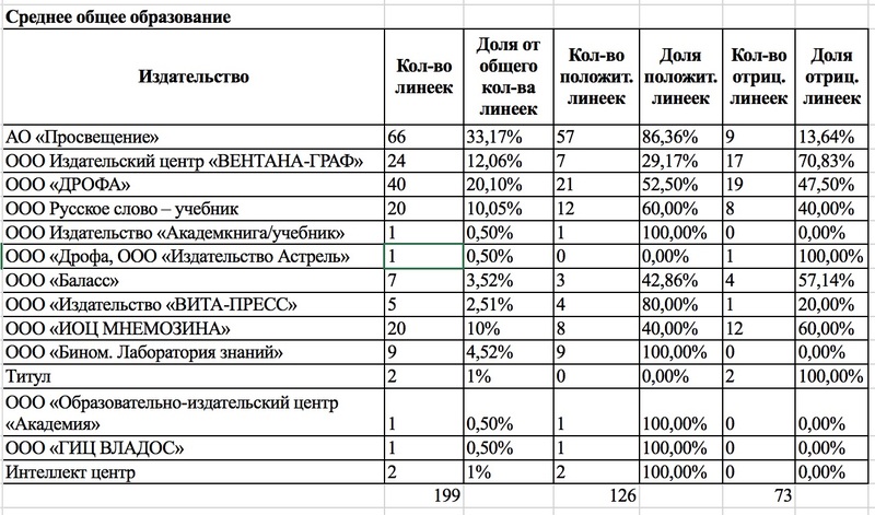 Эксперты бьют тревогу: практически полностью монополизированной «Просвещением» оказывается начальная школа, а в основной и старшей школах почти полностью монополизируются следующие направления: математика, обществознание, география, литература, история, химия, русский язык, искусство, музыка. Особенно это бросается в глаза в 10–11 классах, в которых отрицательные заключения по итогам дополнительной экспертизы получили даже те линии конкурентов, которые сохранились в 5-9 классах.