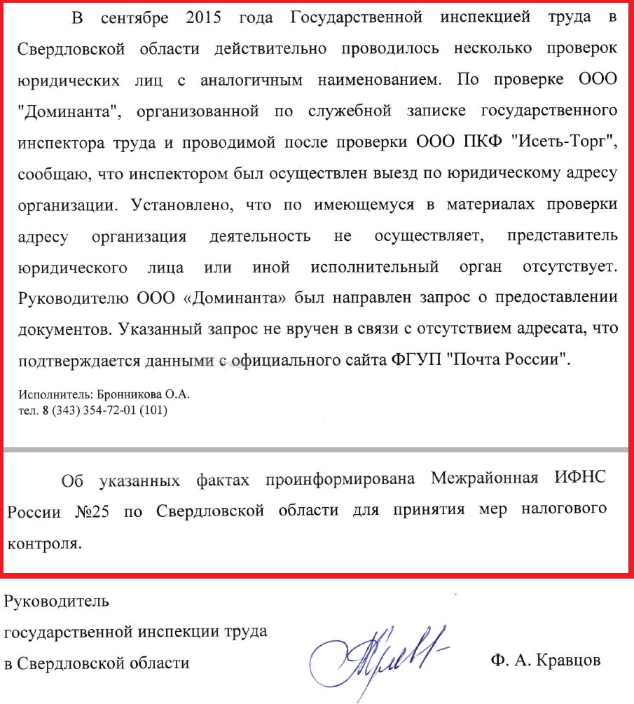 Госинспекторы по труду попытались выйти с проверкой в ООО «Доминанта». «Установлено, что по имеющемуся адресу организация деятельность не осуществляет, представитель юридического лица или иной исполнительный орган отсутствует. Руководителю ООО «Доминанта» был направлен запрос о предоставлении документов. Указанный запрос не вручен в связи отсутствием адресата, что подтверждается данными с официального сайта ФГУП «Почта России», - сообщил журналистам главный госинспектор по труду Федор Кравцов. – Об указанных фактах проинформирована Межрайонная ИФНС № 25 по Свердловской области для принятия мер налогового контроля».