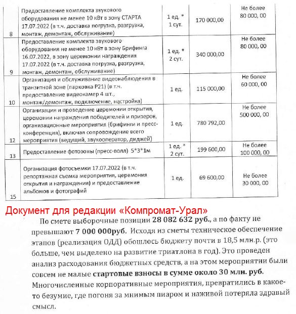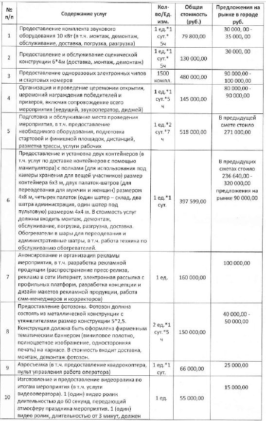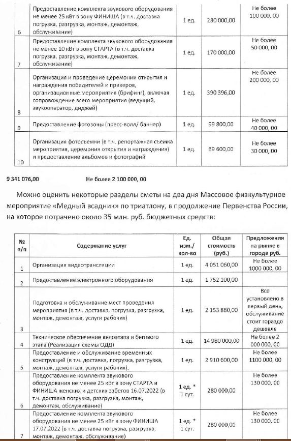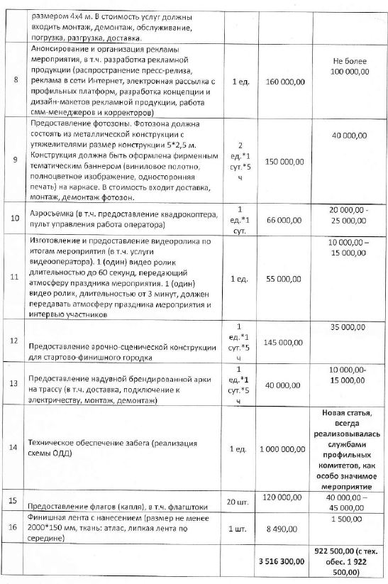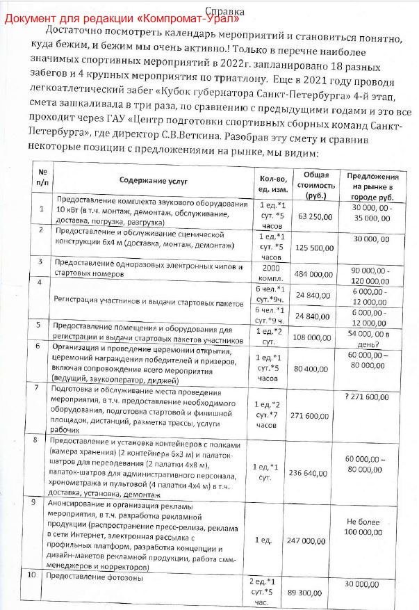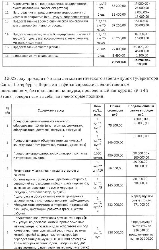 К примеру, в прошлом 2021 году при проведении 4-го этапа массового легкоатлетического забега «Кубок Губернатора Санкт-Петербурга», смета, судя по всему, была в три раза выше, чем в прошлые годы. Разбор сметы специалистами показывает, что, в частности, расходы на установку сцены, задекларированные в 125 тыс. рублей, максимально могут быть не более 40 тысяч, предоставление 8-ми шатров указанных размеров, стоят 80 тыс. рублей, а в смете забито на эти цели около 240 тысяч, и так далее.