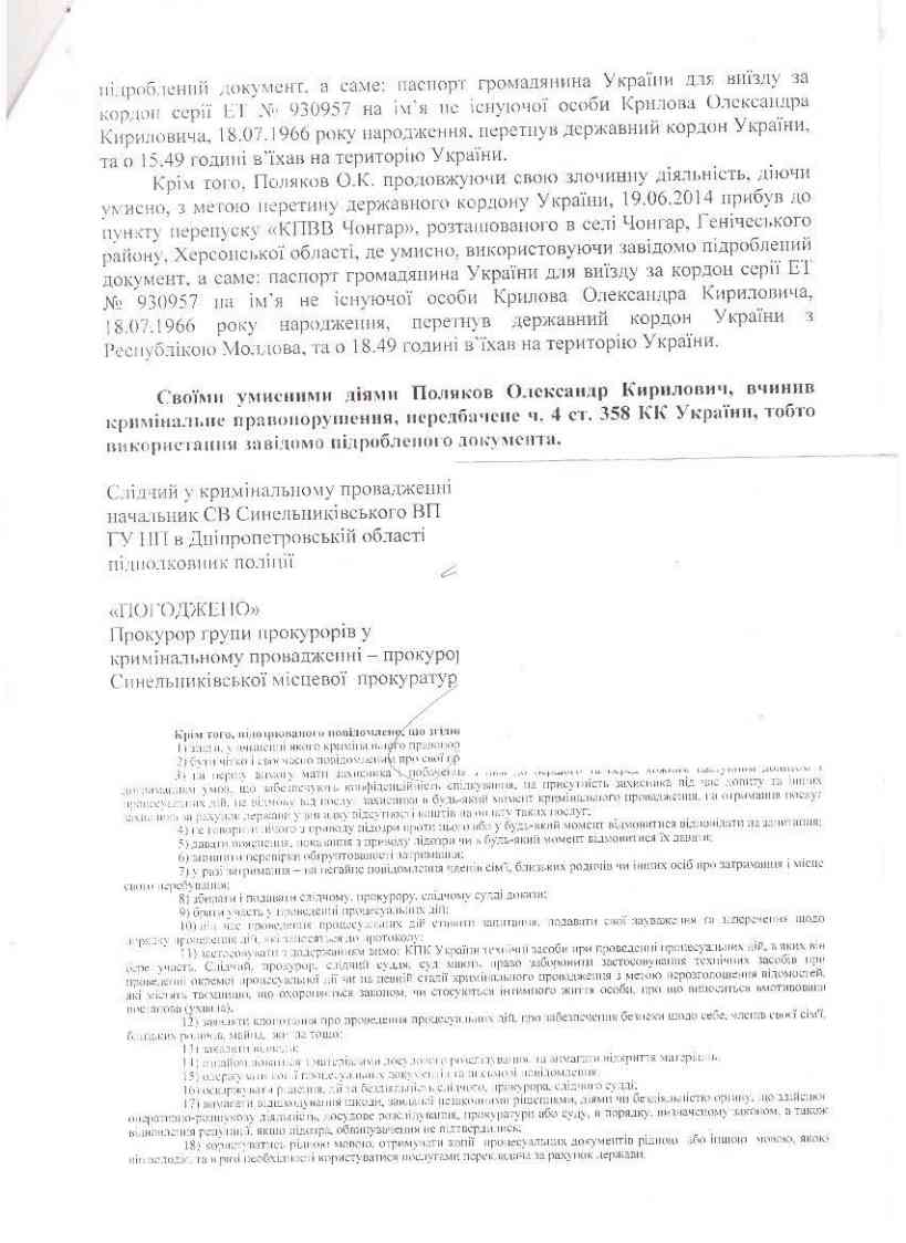 В подложном паспорте Поляков был указан как Олександр Крилов, 18 июля 1966 года рождения, реальная дата рождения Полякова – 19 июля 1965-го. В итоге Полякову инкриминировано преступление по ч. 4 ст. 358 УК РФ Украины: использование заведомо поддельного документа. Редакция «Компромат-Урал» публикует процессуальный документ МВД Украины, возглавляемого Арсеном Аваковым в правительстве Петра Порошенко, и предлагает всем неравнодушным и информированным читателям прокомментировать его по адресу: kompromat-ural@protonmail.com