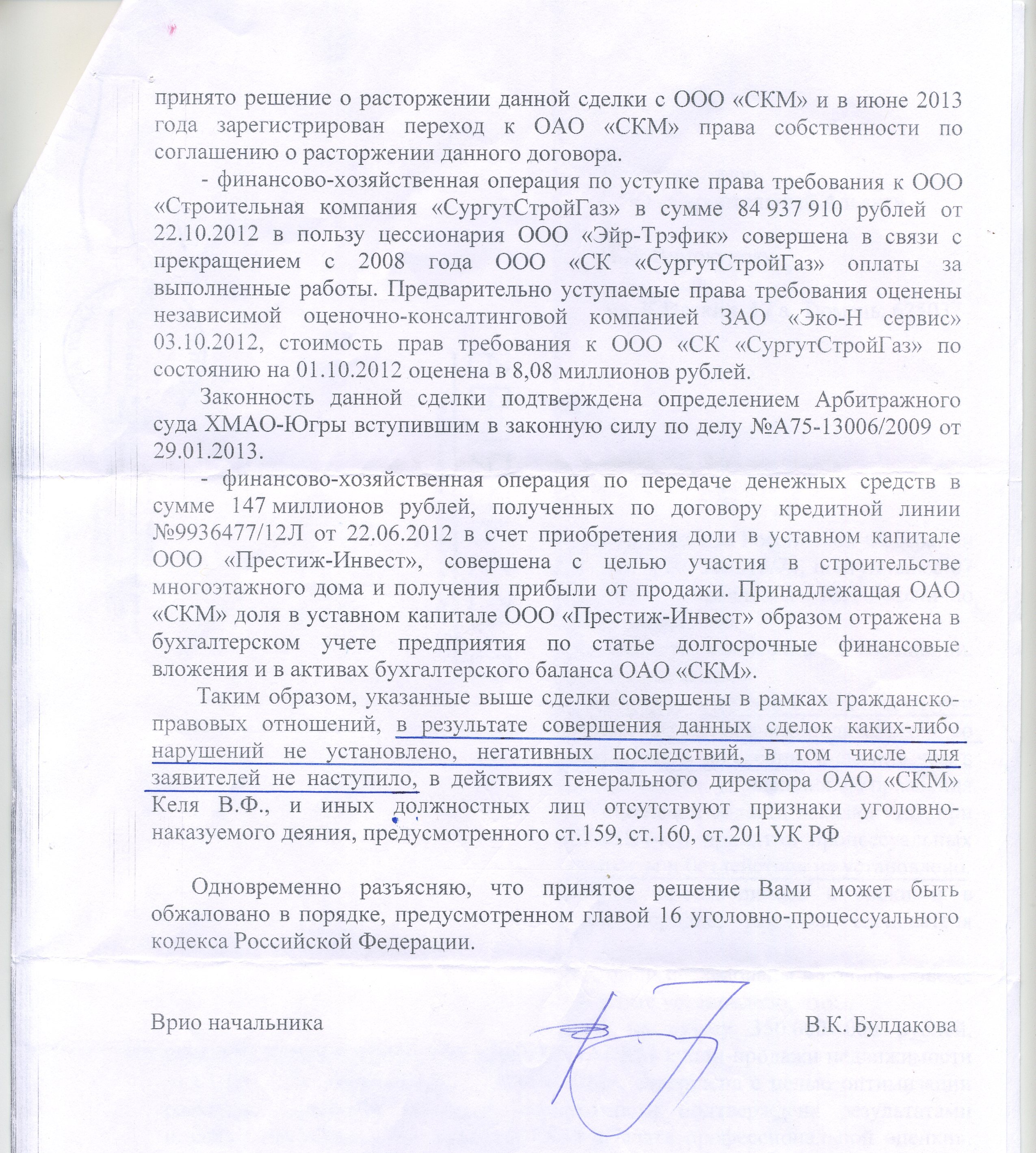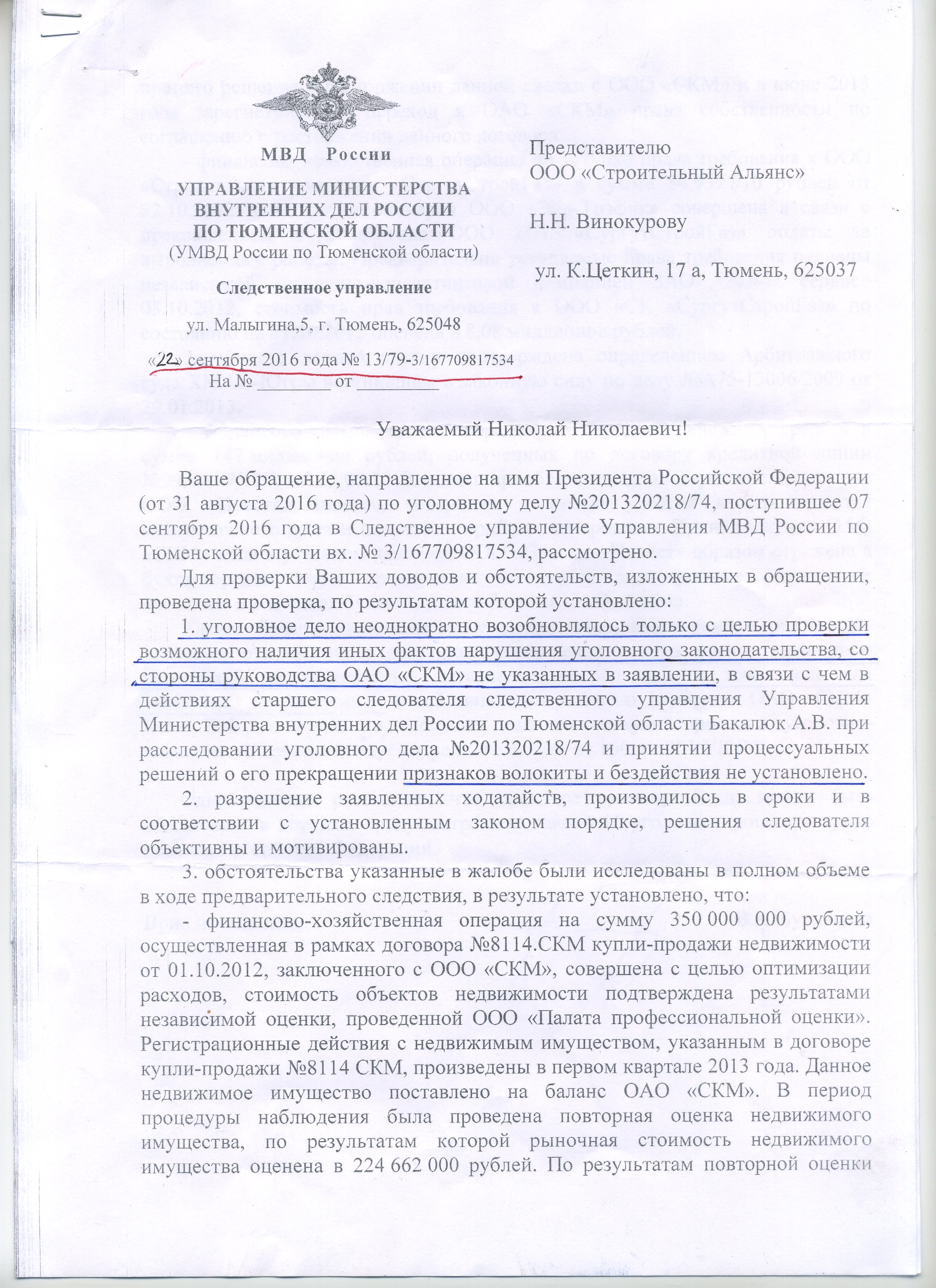 22 сентября 2016 года полковник Вера Булдакова, временно исполняя обязанности начальника СУ, сообщает в своей отписке: оказывается, уголовное дело реанимировалось бесчисленное количество раз не из-за того, что расследования как такового не было, и прокуратура столько лет тыкала носом в невыполненные следственные действия, на них беспрестанно указывала и потерпевшая сторона. Всего этого как бы не нет. «Уголовное дело неоднократно возобновлялось только с целью проверки возможного наличия иных фактов нарушения законодательства со стороны руководства ОАО «Стройкомплектмонтаж», не указанных в заявлении». И далее: в действиях старшего следователя Бакалюка… «признаков волокиты и бездействия не установлено». Приехали!
