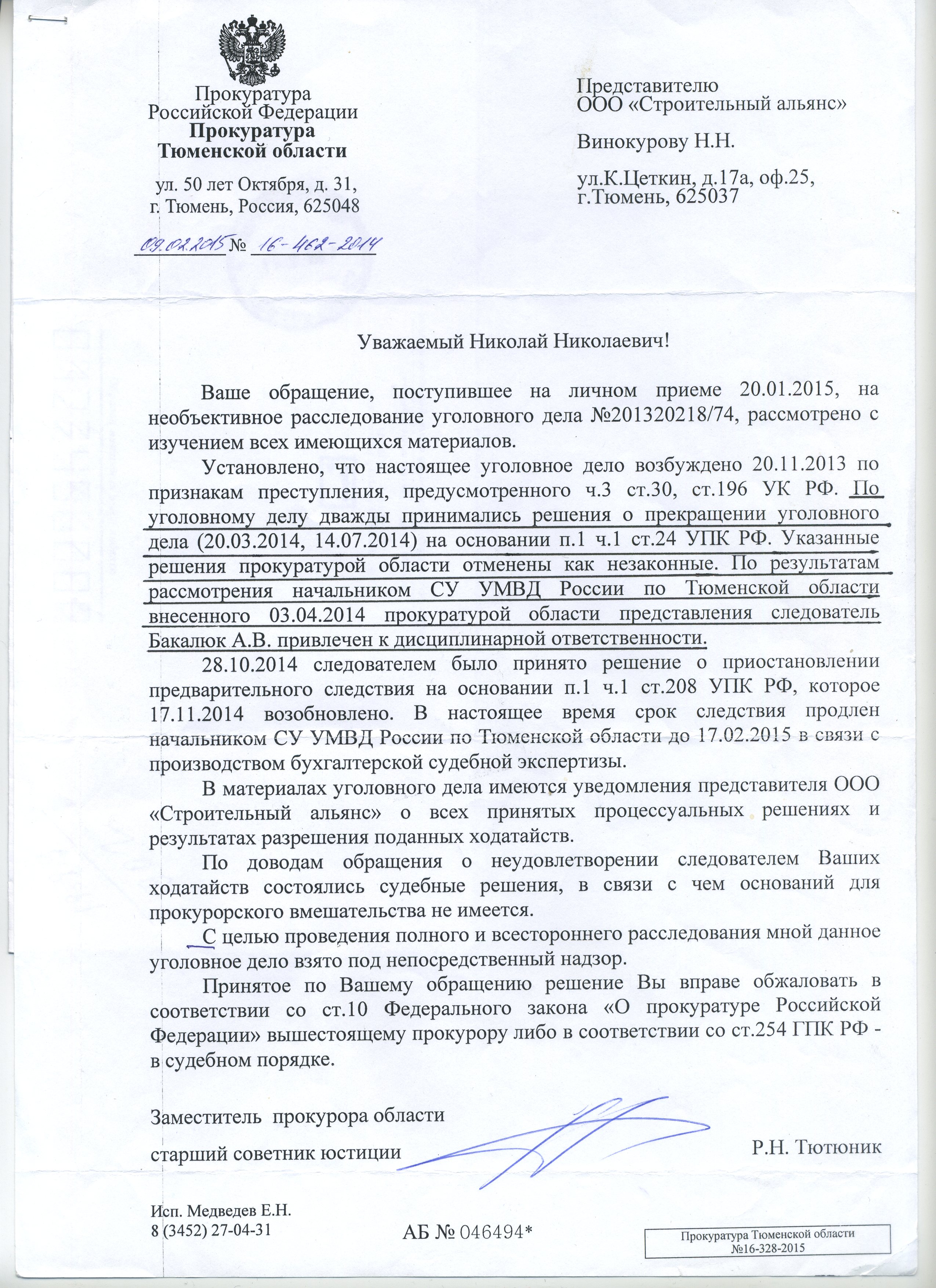 В феврале 2015 года зампрокурора Тюменской области Роман Тютюник официально сообщит потерпевшей стороне, что еще в апреле 2014 года следователь Бакалюк по требованию прокуратуры был дисциплинарно наказан начальником следственного управления. По делу (наконец-то) назначена судебная бухгалтерская экспертиза. В заключение господин Тютюник сделал нетипичную для большинства прокурорских ответов ремарку: «С целью проведения полного и всестороннего расследования уголовное дело взято мной под непосредственный надзор».