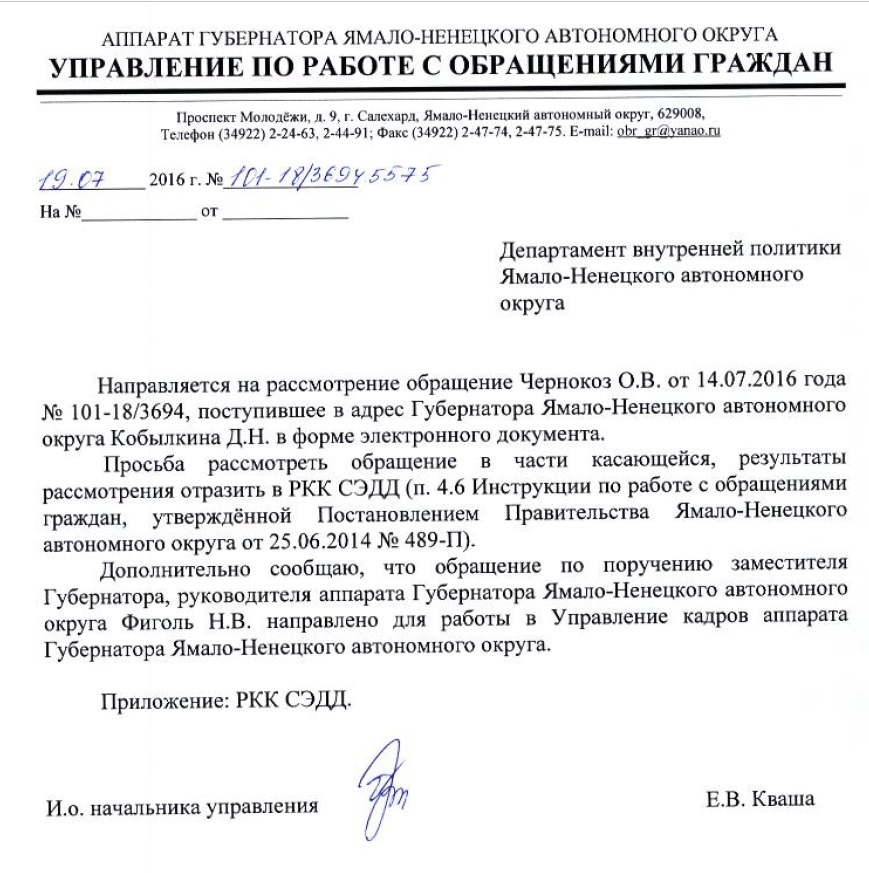 Но эти требования в аппарате Дмитрия Кобылкина проигнорировали. Только 25 июля на электронный адрес редакции поступило формальное письмо за подписью и.о. начальника управления по работе с обращениями граждан Елены Квашы (правда, внутри канцелярии оно зарегистрировано более ранней датой, 19 июля – известная чиновничья хитрость).