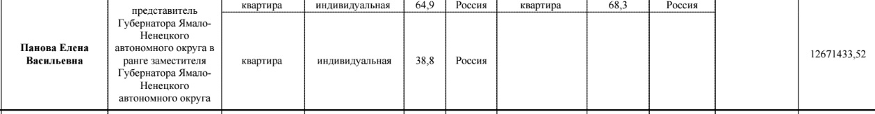 Между тем, продолжая собственное расследование, наши корреспонденты нашли практически единственное упоминание о Пановой Елене Васильевне. Она числится «представителем губернатора ЯНАО в ранге заместителя губернатора ЯНАО» - столь замысловатое название должности среди прочих чиновников Ямала есть только у Пановой. Сведения о ней удалось найти в разделе о доходах и имуществе сотрудников аппарата Дмитрия Кобылкина. Скрывать информацию, которая обязательная к декларированию по нормам антикоррупционного законодательства, юридически и политически гораздо опаснее, нежели «футболить» прессу. В Салехарде рисковать не стали…