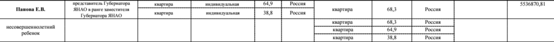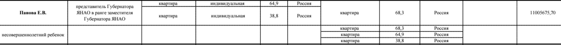 Исходя из анализа имущественных данных о Пановой, Елена Васильевна занимает нынешнюю должность то ли «представителя», то ли «заместителя» Кобылкина с 2013 года (в декларационных выписках 2012 года она еще не значится). За три года службы официальный доход чиновницы составил 29 млн. 213 тыс. 980 рублей (при грубом округлении – более 811 тысяч ежемесячно!). Прятать информацию от ямальских налогоплательщиков о настолько высокооплачиваемой госслужащей – согласитесь, подозрительно. Елена Панова декларирует две собственные квартиры и одну - в пользовании. Судя по документам, в 2014 году она стала мамой, т.к. с этого периода в декларации появился несовершеннолетний ребенок.