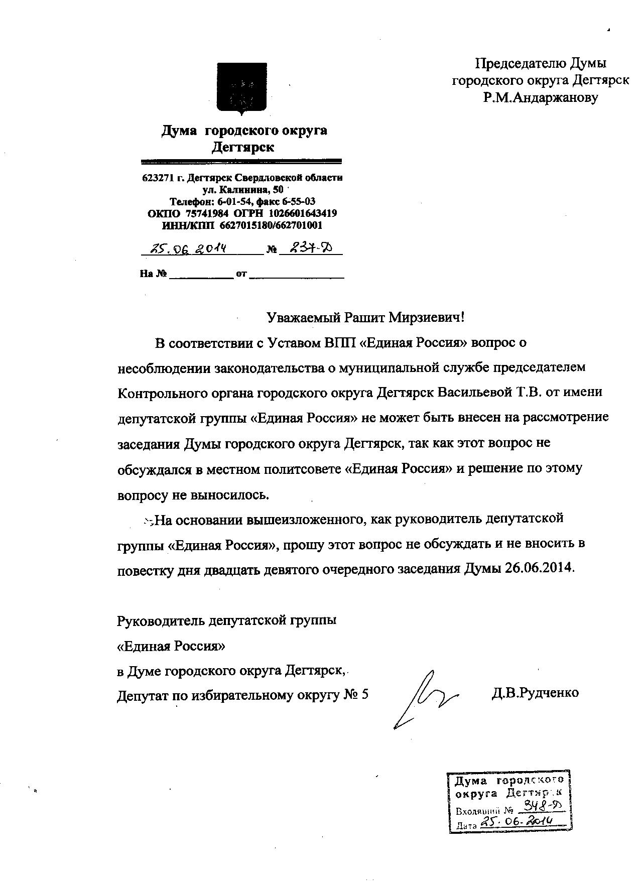 Так, проиграв суд по незаконному увольнению председателя Контрольного органа, мэр И. Бусахин теперь пытается додавить Т. Васильеву через местных депутатов-единороссов. 23.06.2014 они под видом «депутатской фракции «Единая Россия» намеревались внести вопрос об ее отставке в повестку заседания. Заговор, выгодный мэру, был сорван благодаря принципиальности секретаря городского отделения партии Сурикова Леонида Николаевича (редкость для местных высокопоставленных партийцев!). Он открыто разоблачил продажность «инициативщиков», которые подконтрольны администрации, с чьей стороны «был использован административный ресурс» (см. скан письма). Свидетельством бардака в партии стало дальнейшее поведение депутатов-единороссов в дегтярской Думе: они тут же полностью развернули свою позицию на 180 градусов и отказались от обсуждения еще недавно «очень актуального» для них вопроса (см. скан письма руководителя депутатской группы Д.В. Рудченко). Надолго ли?