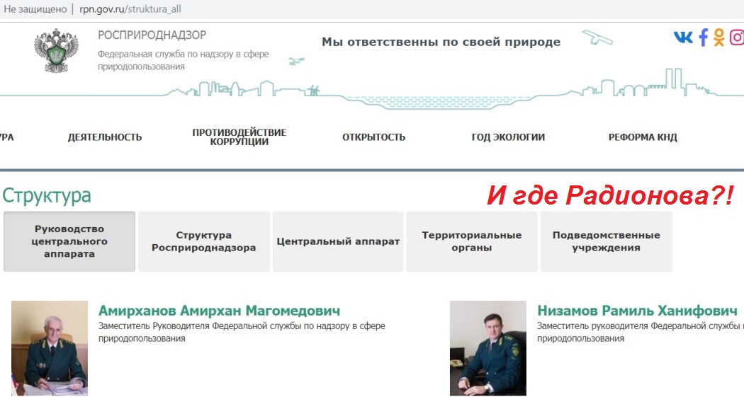 Читатели портала «Компромат-Урал» обращают внимание на имиджевую странность в деятельности Светланы Радионовой. В Ростехнадзоре, как неоднократно отмечали журналисты, она была единственным замом главы службы Алексея Алёшина, которая позволяла себе не раскрывать свою биографию на официальном сайте ведомства. Жизненный путь Радионовой действительно вызывает вопросы. Ту же «секретную» манеру чиновница принесла с собой в Росприроднадзор. На его сайте нет (!) биографии руководителя, в разделе «Руководство центрального аппарата» имеются сведения лишь о двух замах Радионовой: Амирхане Амирханове и Рамиле Низамове. Нонсенс в практике органов исполнительной власти! Чего «стесняется» их начальница?