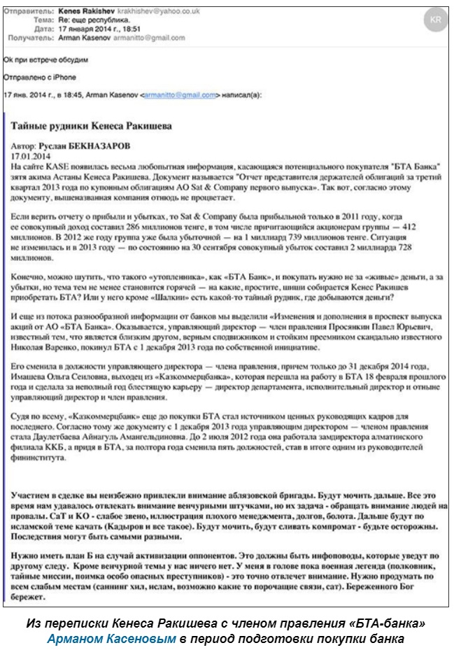 Махинации с банком хорошо известны правоохранительным органам Казахстана, а также спецслужбам ряд других государств. Публиковались данные, что Ракишев попал в оперативную разработку и может оказаться за решеткой. В СМИ попала информация о том, что оппоненты Тимура Кулибаева получили в свое распоряжение компрометирующие материалы, позволяющие обвинить среднего зятя «лидера нации» в расхищении $10 млрд из активов АО «БТА Банк» и таким способом попытаться не только выбить его из политической колоды, но и лишить всего имущества», - подытоживает ИА «Руспрес».