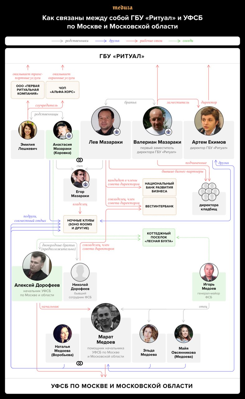 Дозвониться до Валериана и Льва Мазараки «Медузе» не удалось. Валериан не ответил на письмо, направленное на его имя через почту пресс-службы ГБУ «Ритуал». Лев не ответил на вопросы, отправленные ему в фейсбук. В Центре общественных связей ФСБ России и в пресс-службе УФСБ по Москве и Московской области запросы о комментариях на имя Марата Медоева и Алексея Дорофеева оставили без ответа.