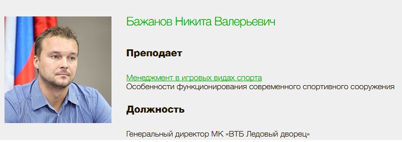 Всё было бы замечательно, но беда в том, что сам Никита Бажанов является генеральным директором МК «ВТБ Ледовый дворец». Информация об этом есть в открытом доступе, на официальном сайте бизнес-школы РМА, где Бажанов ещё числится в качестве преподавателя.