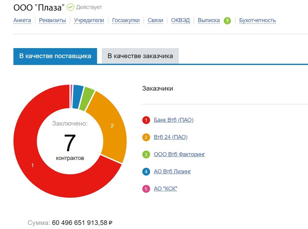 Или вот ООО «Плаза» где ВТБ24 провело закупок на 17 миллиардов рублей (!).Основными поставщиками для этой ООО «Плаза» были АО «МПК», ООО «ЦТП МОЭК» и ВТБ Страхование. Последнее, опять же, косвенно, свидетельствует о связи топ-менеджеров «Плазы» с ВТБ. Если же смотреть по заказчикам «Плазы» то все они представляют ВТБ – сумма контрактов с группой ВТБ у ООО «Плаза» составляет 60 миллиардов рублей (!). Компания в праве претендовать на роль одного из королей государственного заказа. Почти миллиард долларов госконтрактов!