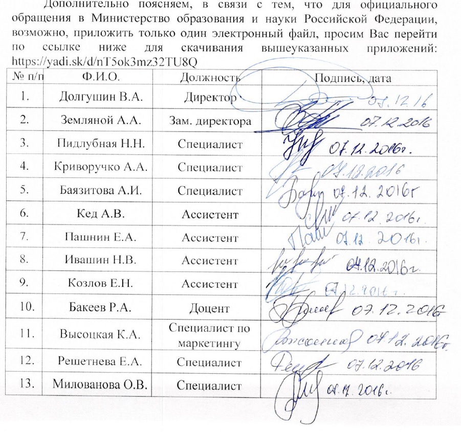 Дополнительно поясняем, в связи с тем, что для официального обращения в Министерство образования и науки Российской Федерации, возможно, приложить только один электронный файл, просим Вас перейти по ссылке ниже для скачивания вышеуказанных приложений: https://yadi.sk/d/nT5ok3mz32TU8Q