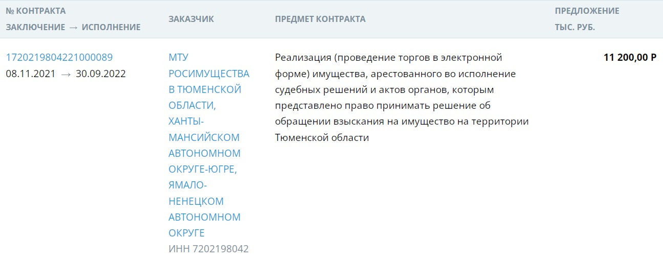 На этот раз привет господину Яковенко прилетел из Тюмени. 08.11.2021 с челябинской фирмой ООО «Феникс» (ИНН 7453318299, директорша – Луиза Федулина) руководитель управления Росимущества по Тюменской области заключил контракт по реализации арестованного имущества. Сумма контракта удивила даже самых отчаянных игроков и составила МИНУС 11 миллионов 200 тысяч рублей. То есть это не сумма, которую должна получить фирма от государства, выполнив контракт, а входной билет на право продавать имущество.