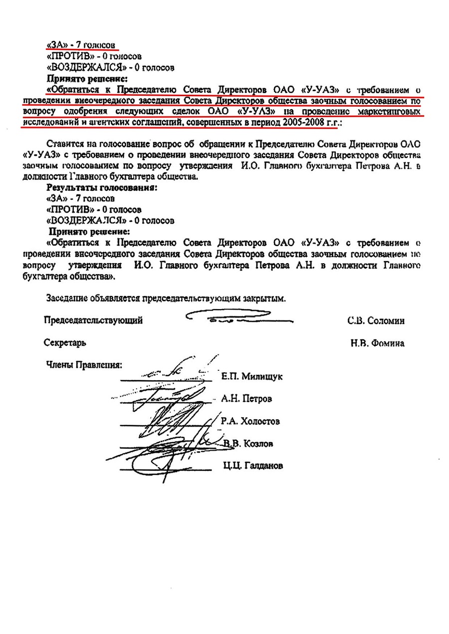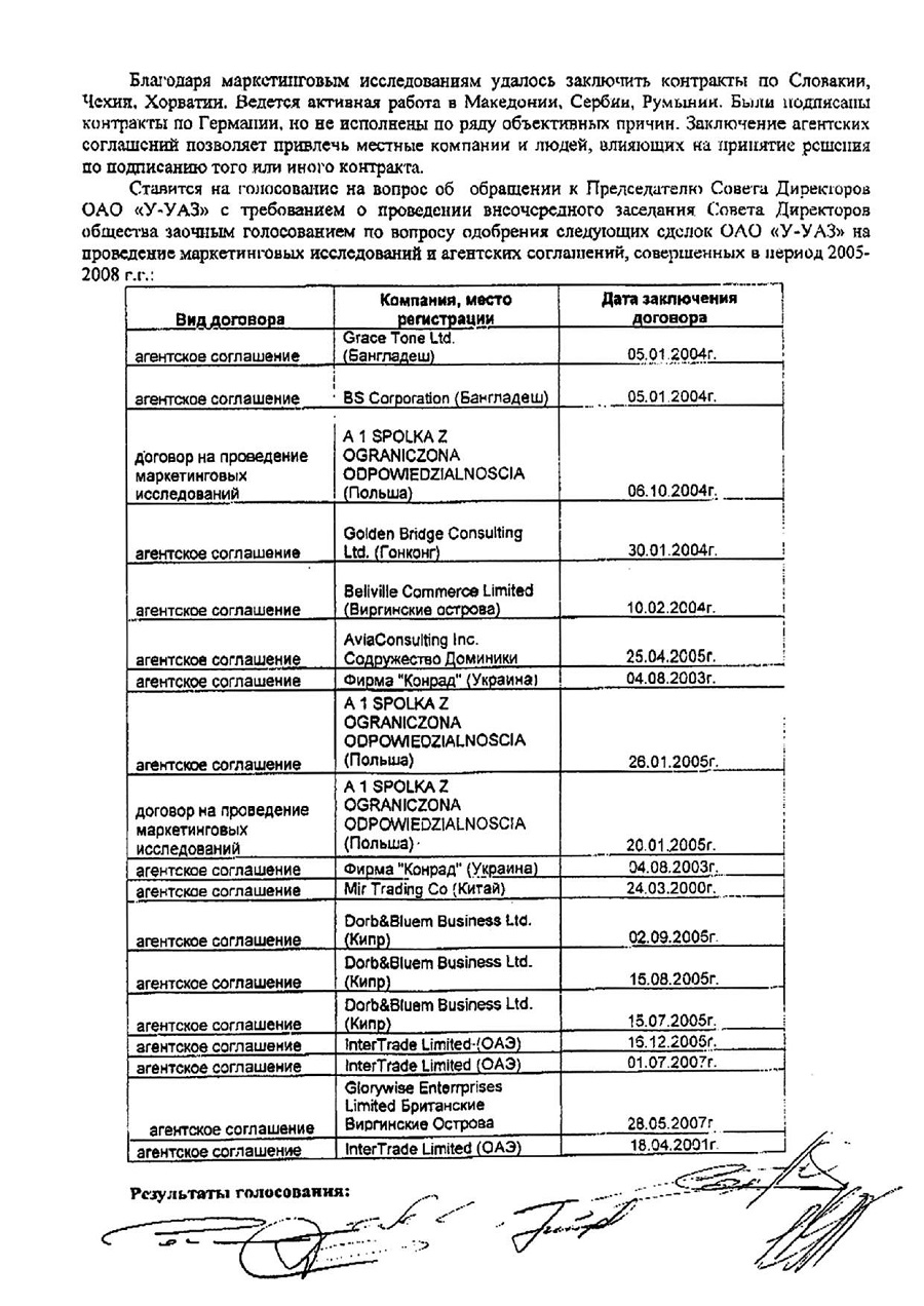 Там же сообщается, что якобы в 2008 году местное управление ФСБ даже пыталось разыскать эти средства. Как было на самом деле, мы не знаем, но в пользу версии, изложенной «АПН Северо-Запад», можно рассматривать Протокол правления У-УАЗ от 20.05.2008 года, благодаря которому были утверждены все сделки с офшорами (в том числе и названными в публикации), проведённые в период 2004-2007 годов. Зачем понадобилось в 2008 году утверждать старые сделки? Разве, чтобы снять личную ответственность с Леонида Белых в период проведения расследования, о котором упоминалось в цитируемой публикации?