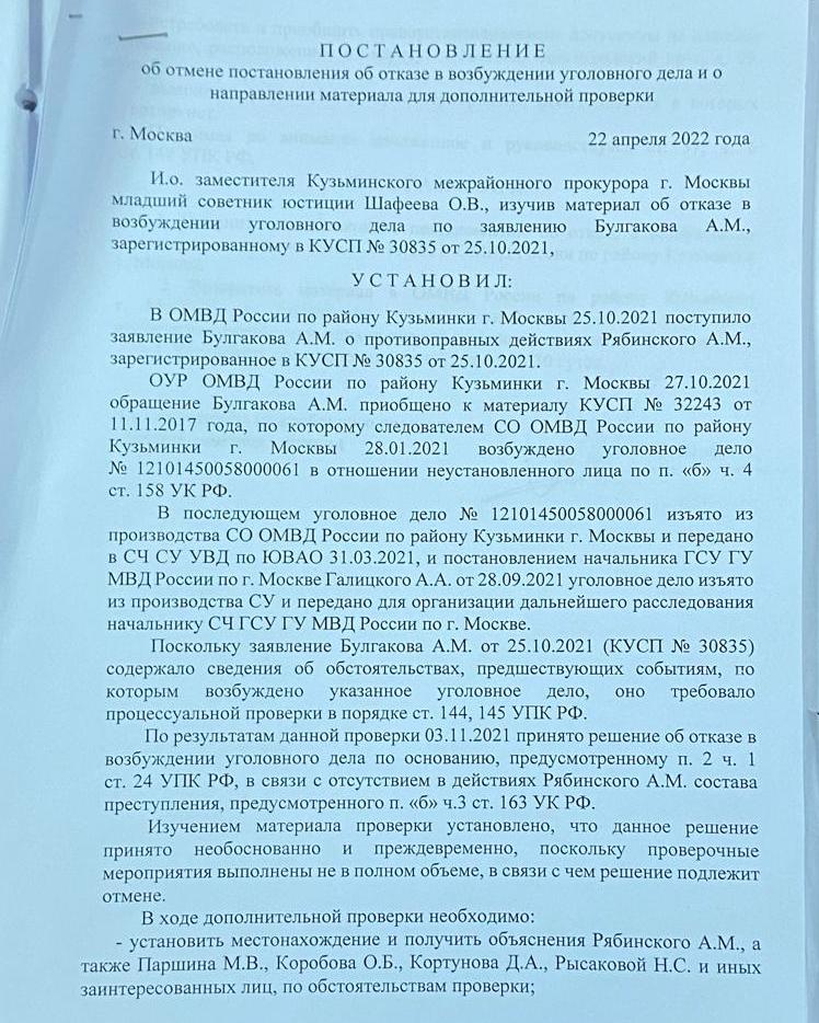 Сегодня представляем вниманию читателей первый документ. Это процессуальное постановление Кузьминской межрайпрокуратуры Москвы от 22 апреля 2022 года. Из него можно сделать любопытные наблюдения относительно коррупционных траекторий, по которым «гуляют» заявления граждан, пострадавших от действий господина Рябинского. В частности, жертвой вымогательства стал предприниматель Антон Булгаков. О его злоключениях подробно сообщала редакция «Компромат-Урал» в публикации под заголовком «Андрей Рябинский. Скандальная биография и тюремные перспективы оголтелого МИЦовца». Для понимания сути отметим, что, согласно заявлению Булгакова, объектом рейдерских посягательств стал принадлежавший ему дорогостоящий объект недвижимости в Москве на Волгоградском проспекте, 99, стр. 1.