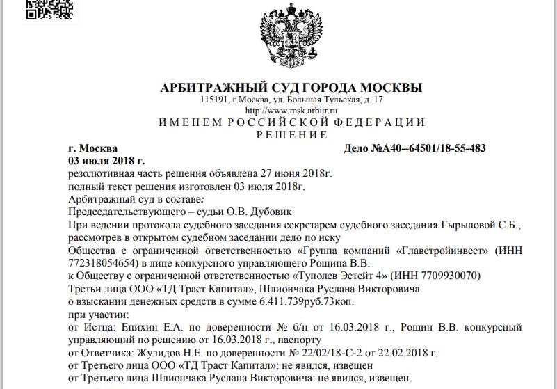 Якобы должник "ТД Траст Капитал" переуступает право требования долга ГСИ а тот в положенное время денег от "Туполев Эстейт 4" почему-то не получает. И требует их возвращения в судебном порядке. Казалось бы, что за комедия? Аффилированные друг с другом предприятия устраивают между собой разбирательства, которые доходят до суда. Однако здесь не всё так просто.