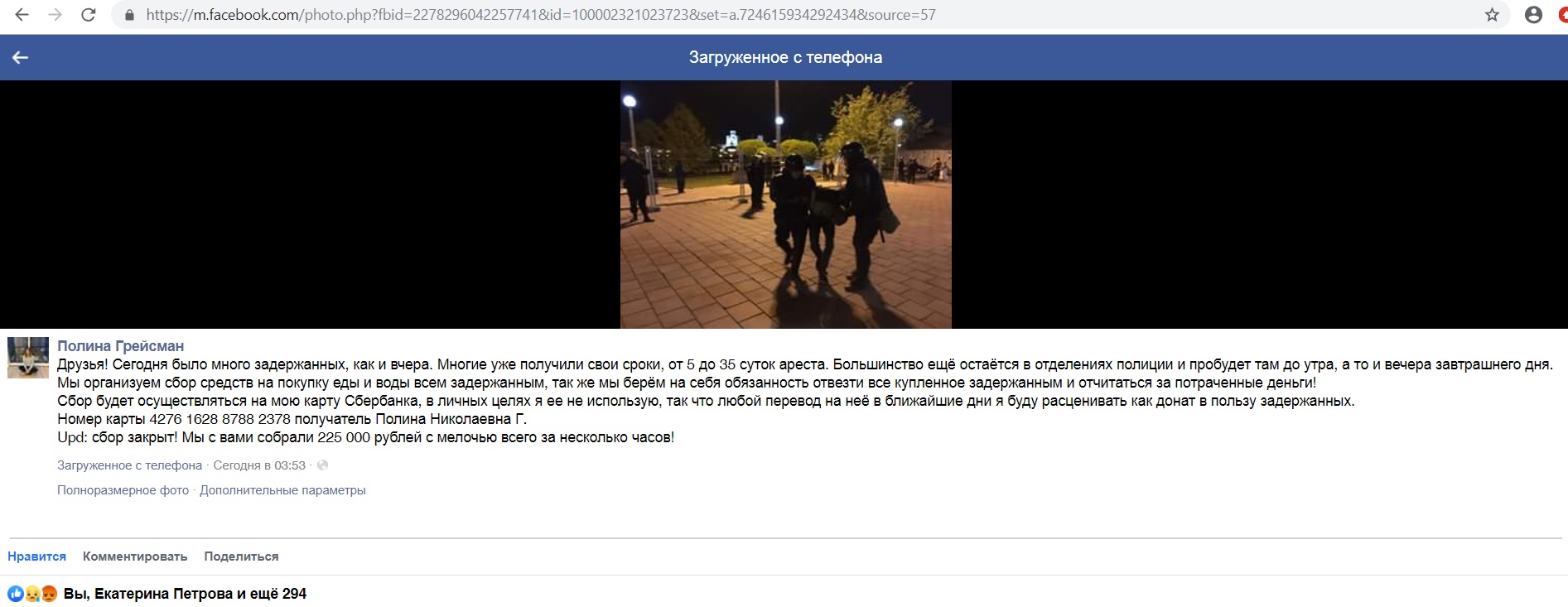 Сбор средств для помощи протестующим производится на карту Сбербанка 4276162887882378, принадлежащую общественнице Полине Грейсман, сообщает обозреватель редакции «Компромат-Урал». «Большинство [задержанных] еще остается в отделениях полиции… Мы организуем сбор средств на покупку еды и воды всем задержанным, также берем на себя обязанность отвезти все купленное задержанным и отчитаться за потраченные деньги!» - заявила Полина Грейсман.