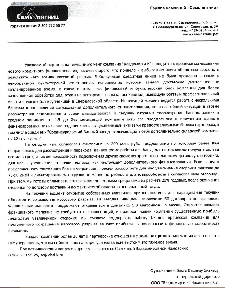 «Уважаемый партнер, на текущий момент компания «Владимир и К» находится в процессе согласования нового кредитного финансирования… в результате чего возник кассовый разрыв», - такими словами начинается воззвание гендиректора. Далее он признает, что прежний кредит для компании не продлен «в связи с некорректной бухгалтерской отчетностью». Исправление финансового бардака занимается сторонняя структура – компания «Капитал». Компания Чамовских уговаривает банки на новые кредиты, но «рассмотрение затягивается, сроки откладываются».