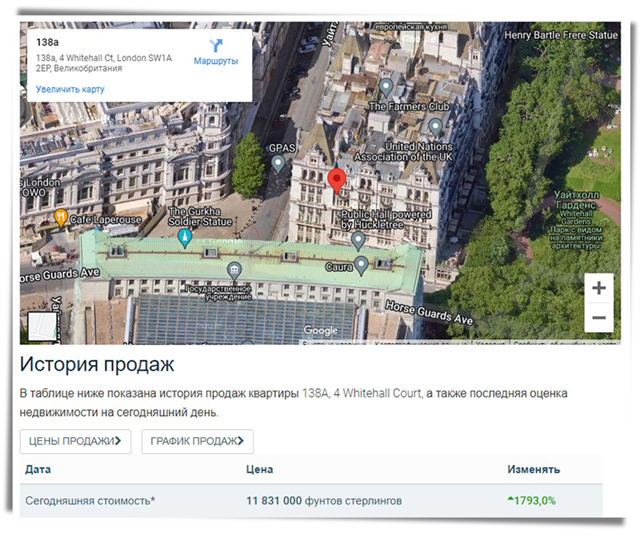 Несколько месяцев назад международный Центр по исследованию коррупции и организованной преступности (OCCRP; оператор проекта – американская Ассоциация развития журналистики, внесённая в реестр нежелательных организаций на территории РФ) обнародовал подробные сведения о принадлежащей россиянам лондонской недвижимости. По его информации, в случае с Sova Real Estate LLC речь идёт о квартирах, расположенных по адресам: Greater London – NGL923298 – Leasehold – 4 Whitehall Court, London (SW1A 2EP). Ресурс The Move Market уточняет, что на сегодняшний день их стоимость выросла незначительно – до 11,831 млн фунтов стерлингов.