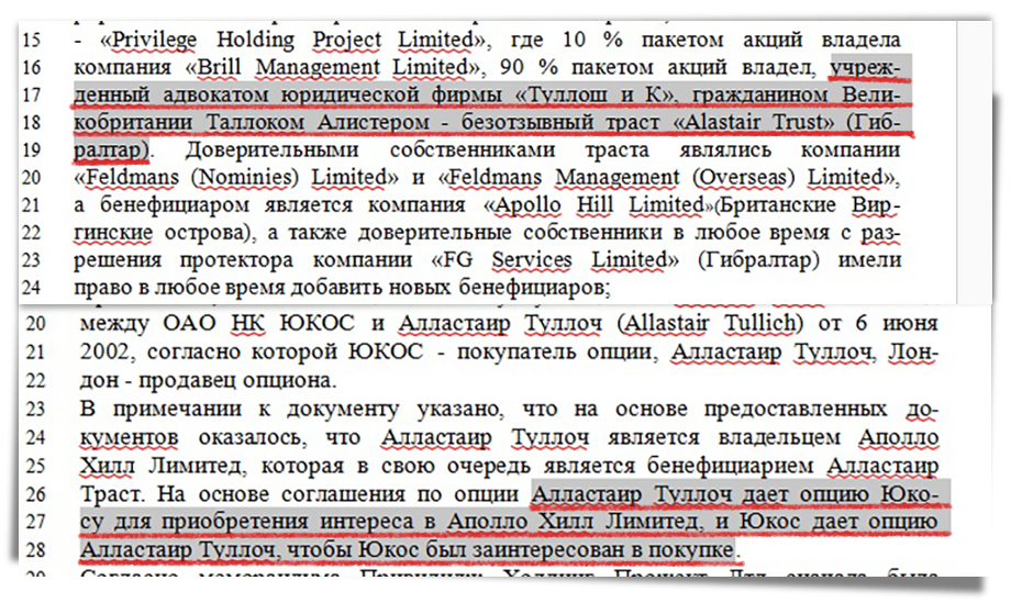 В число наиболее знаковых клиентов британского юриста входил и вышеназванный Михаил Ходорковский, являющийся «красной тряпкой» для Кремля. Аластер Таллок и созданные им фонды неоднократно упоминаются в обвинительном заключении по делу ЮКОСа как участники осуществлявшихся окружением Ходорковского коммерческих схем.