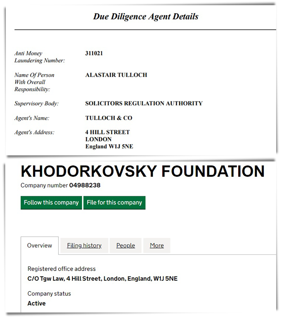Учреждённый в Великобритании Фонд Ходорковского (организация, разумеется, признана нежелательной на территории РФ) зарегистрирован по тому же адресу, что и компания Аластера Таллока: C/O Tgw Law, 4 Hill Street, London, England, W1J 5NE.