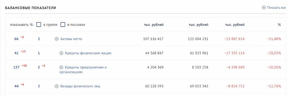 Вклады физических лиц снизились на 8.8 млрд руб. (12.7%), кредиты физическим лицам – на 17.3 млрд руб. (28%). Помимо этого объем кредитов, выдаваемых предприятиям и организациям, уменьшился на 4.2 млрд руб. (50.5%). Вслед за физическими лицами из банка стали уходить и юрлица. Судя по проценту, это даже не уход, а побег.