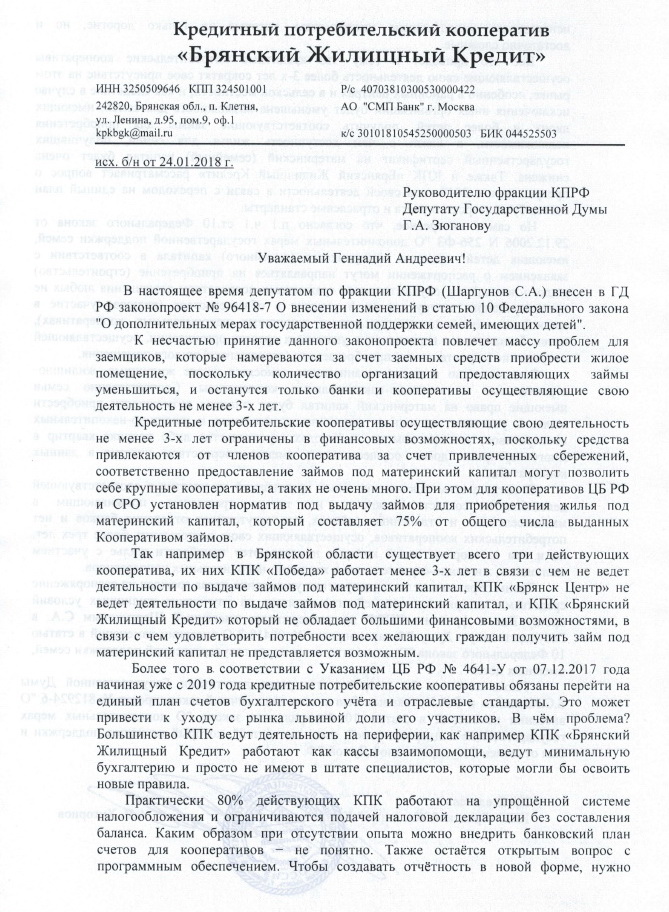 Хотя, поверить в то, что специалистов у КПК «Брянский жилищный кредит» нет, можно. Достаточно сказать, что обращение на имя Зюганова написано А.В. Хуторцовым с грамматическими ошибками. В частности, пропущены запятые при использовании причастных оборотов.
