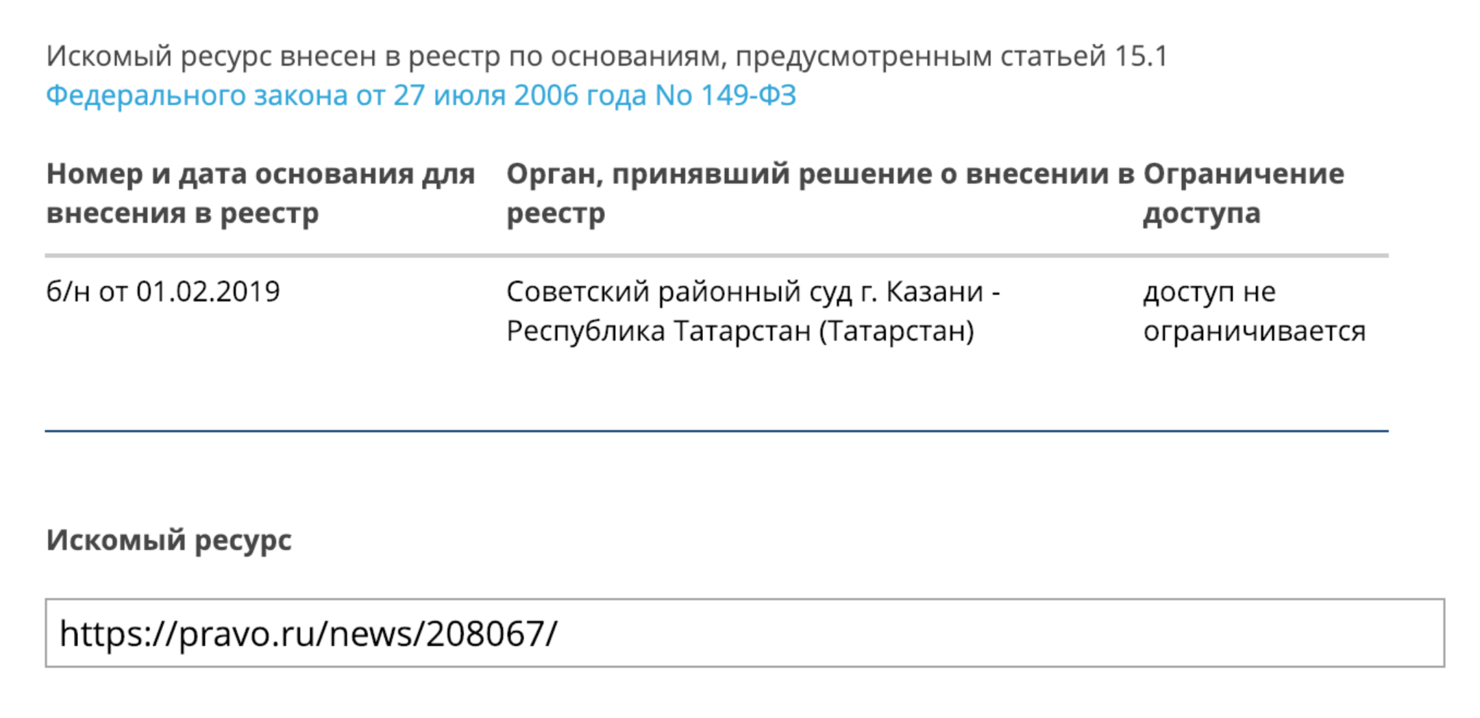 Пресс-служба Роскомнадзора не смогла назвать номер дела, на основании которого ресурс заблокирован (номер также не был указан в реестре – см. скрин). «Доступ к информации на странице https://pravo.ru/news/208067 был ограничен администрацией интернет-ресурса на основании определения Советского районного суда г. Казани Республики Татарстан (Татарстан) о принятии обеспечительных мер о защите чести, достоинства, деловой репутации, а также права на изображение», – сообщила пресс-служба РКН. Стоит отметить, что изображения в публикации использованы не были.
