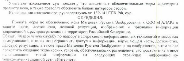 В определение суда от 1 февраля 2019 года говорится следующее. «Обстоятельства дают суду основание полагать, что непринятие мер по обеспечению искового заявления Магдеева Р.Э. Может затруднить или сделать невозможным решение суда. Так, в случае сохранения личной информации на интернет-страницах, указанных в исковом заявлении, с учетом наличия к ним публичного доступа, будет невозможной защита права на изображение, персональные данные и неприкосновенности частной жизни», — говорится в определение. Также сообщается, что отказ от обеспечительных мер вызовет необходимость возбуждения новых судебных процессов. В итоге суд решил ограничить доступ к 66 ресурсам, в том числе публикации на «Право.ру».