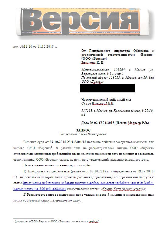 Получилось это следующим образом. Рустэм Магдеев попросил суд принять меры по обеспечению своего иска к ООО «Галар». А именно – заблокировать 50 публикаций на различных сайтах. В том числе, статью на сайте «Версии». По мнению Магдеева, присутствие этих материалов в сети якобы может помешать исполнению решения суда. Судья Черёмушкинского районного суда Елена Ивахова удовлетворила это странное требование. Странное оно потому, что истец не доказал, что наш текст порочит его честь, достоинство и деловую репутацию. Господин Магдеев вообще не предъявил к нам никаких требований в рамках непосредственно иска к ООО «Галар»! Тем не менее, редакцию вынудили скрыть этот общественно-важный материал.