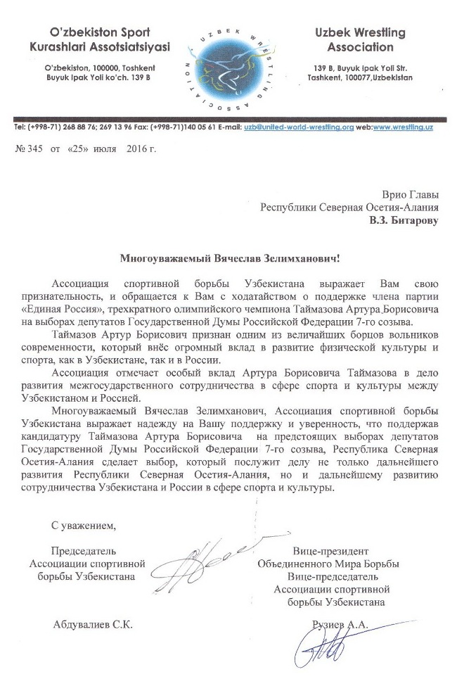 Особую роль в предвыборной кампании Артура Таймазова сыграло давление, которое оказали узбекские бизнесмены на политические элиты России. Искандер Махмудов «договорился» с федеральной властью, а Салим Абдувалиев – с республиканской. При этом Салимбай не придумал ничего лучше, чем направить в адрес Врио Главы Северной Осетии Вячеслава Битарова официальное письмо, в котором убедительно попросил его оказать поддержку Артуру Таймазову в предвыборный период.