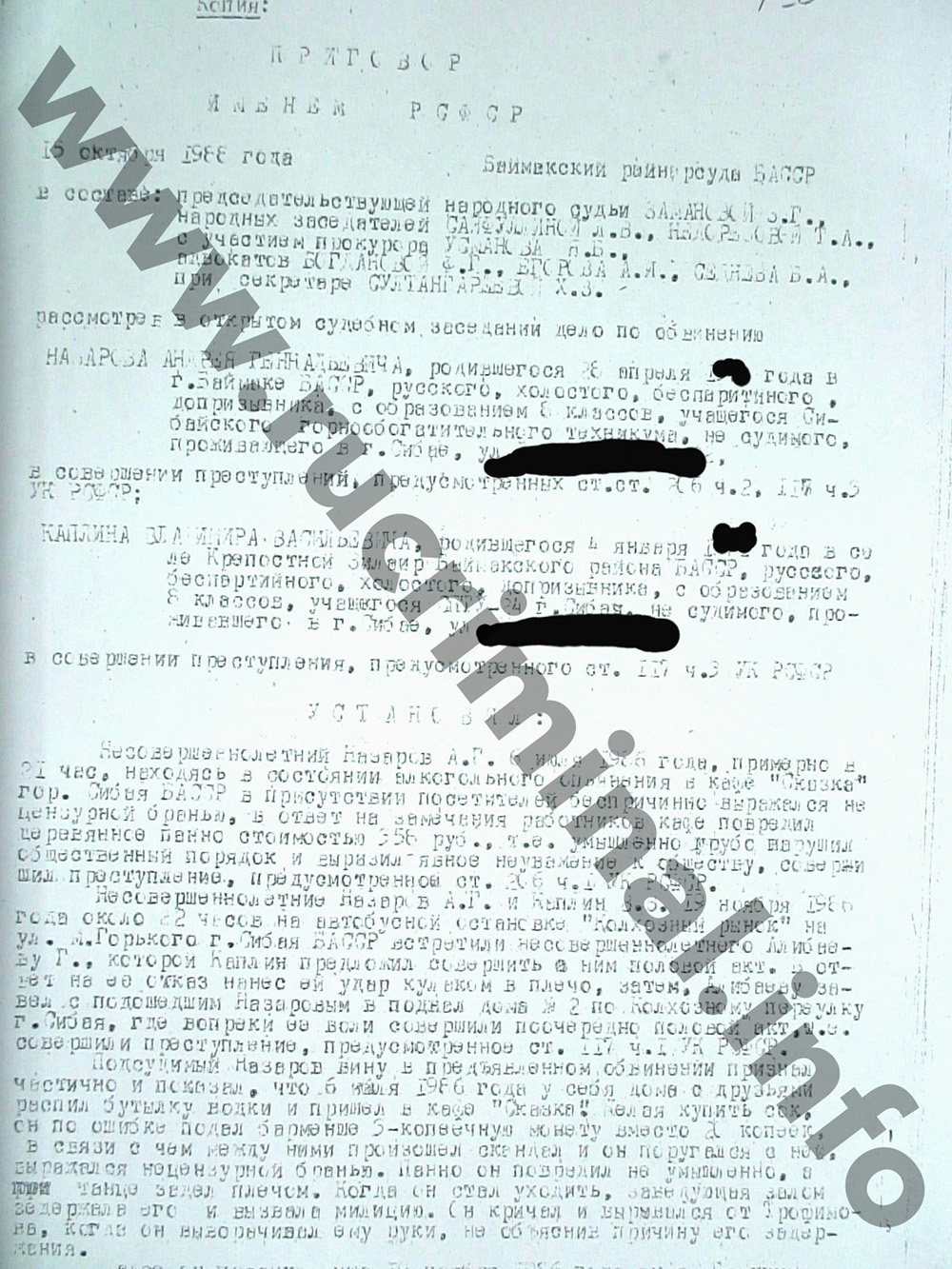 Приговор был вынесен 15 октября 1988 года Баймакским райсудом РСФСР в отношении Назарова Андрея Геннадьевича и Каплина Владимира Васильевича, которые обвинялись по статьям УК РСФСР 206 (хулиганство) и 117 (изнасилование).