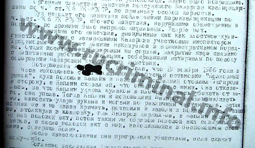 «Потерпевшая А. Г. показала, что 19 ноября 1986 года в 22 часа находилась с Тагировым на автобусной остановке «Колхозный рынок», куда подошли Каплин и Назаров. Последний отозвал Тагирова в сторону, а Каплин сказал ей, что она пойдет с ним. Она отказалась, за что Каплин ударил кулаком в плечо. Пытаясь убежать от него, она упала. Тогда Каплин и подошедший Назаров начали избивать ее, наносить удары руками и ногами по различным частям тела»,- говорится в приговоре, копией которого располагаем — «Затем подняв ее и не давая кричать, потащили и завели в подвал дома. Раздев ее, втолкнули в кладовку, где Назаров держал ее, а Каплин совершил с ней половой акт, потом таким же образом половой акт совершил Назаров, а после половой акт с ней, находившейся в беспомощном состоянии, совершил Полин. После изнасилования они пригрозили убийством, если скажет кому-либо». Эксперты зафиксировали у несовершеннолетней повреждения в виде кровоподтеков и ушибов мягких тканей, относящихся к разряду легких, повлекших за собой кратковременное расстройство здоровья.