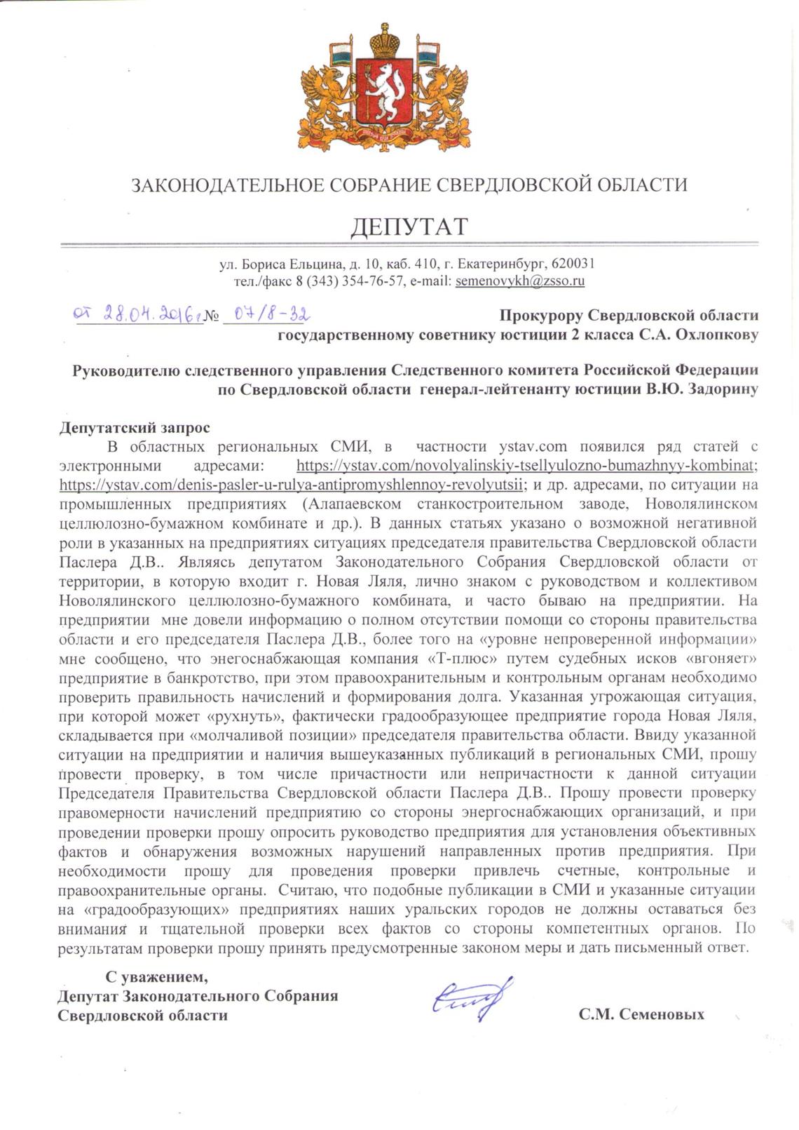 Объяснения Семеновых перед диссоветом запечатлены на видео. По всему видно, что говорящий очень далек от науки и несет в свое оправдание всякий бред и небылицы (ума не хватило хотя бы отрепетировать выступление, дурашка). Впрочем, убедиться в том, что Сергей Семеновых - полный ноль в юридической науке - можно было задолго до диссертационного скандала. Например, пообщавшись с ним. Или прочитав для примера его запрос, датированный апрелем 2016 года, в адрес прокурора Свердловской области Сергея Охлопкова и руководителя СУ СК РФ по региону Валерия Задорина. В нем тогда еще депутат выражает обеспокоенность тем, что премьер Паслер и компания «Т-Плюс» (теперь Паслера прочат в директора этой структуры) олигарха Виктора Вексельберга разоряют предприятия по всей области. Какой замысел, какой антикоррупционный посыл!